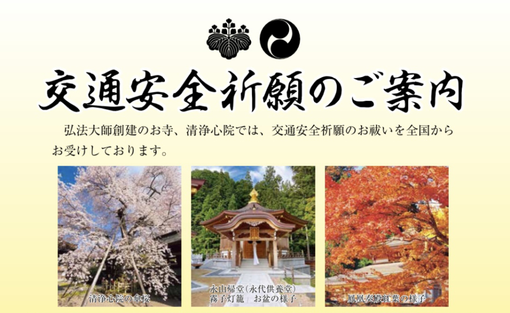 ご自身がどれほど注意を払っても、交通事故は外からやってくることがあります。交通安全祈願を受けて、お不動様の御分身である御守りを頂き、1年間の無事無難安全にお過ごしいただきますようお祈り申し上げます。 -